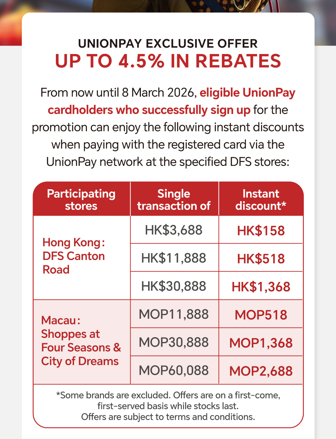 The specific participating brands are subject to in-store displays. As permitted by applicable law, brands decide their own participation in the promotion, and have the final right to withdraw from the promotion during the promotional period. DFS will not bear responsibility for the withdrawal of any brand from the promotion.- All consignment sale brands - Fashion:Charles & Keith - Tobacco and Alcohol: Cigarettes/Cigars, Fine Wines, and Spirits. - A total of no less than 100 quotas for Promotion in HK and Macau will be distributed on a first-come, first-served basis. After successful registration, please check the remaining quotas on the registration page before payment. The promotion will end once all quotas are fully redeemed. Successful registration does not guarantee securing a discount quota.