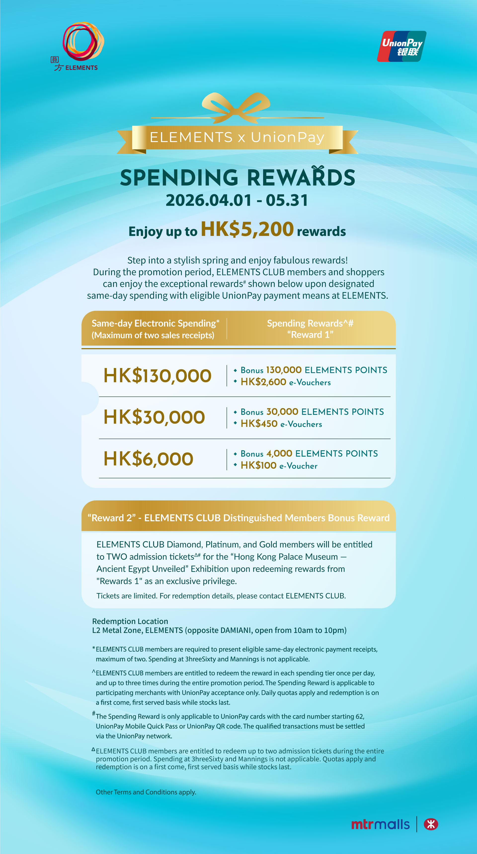 - ELEMENTS CLUB members are entitled to redeem the Reward in each spending tier of “Reward 1” once per day, and up to three times during the entire promotion period. For “Reward 2”, ELEMENTS CLUB members are entitled to redeem up to two admission tickets for the “Hong Kong Palace Museum — Ancient Egypt Unveiled” Exhibition during the entire promotion period. The rewards are applicable to participating merchants with UnionPay acceptance only. Daily quotas apply and redemption is on a first come, first served basis while stocks last.