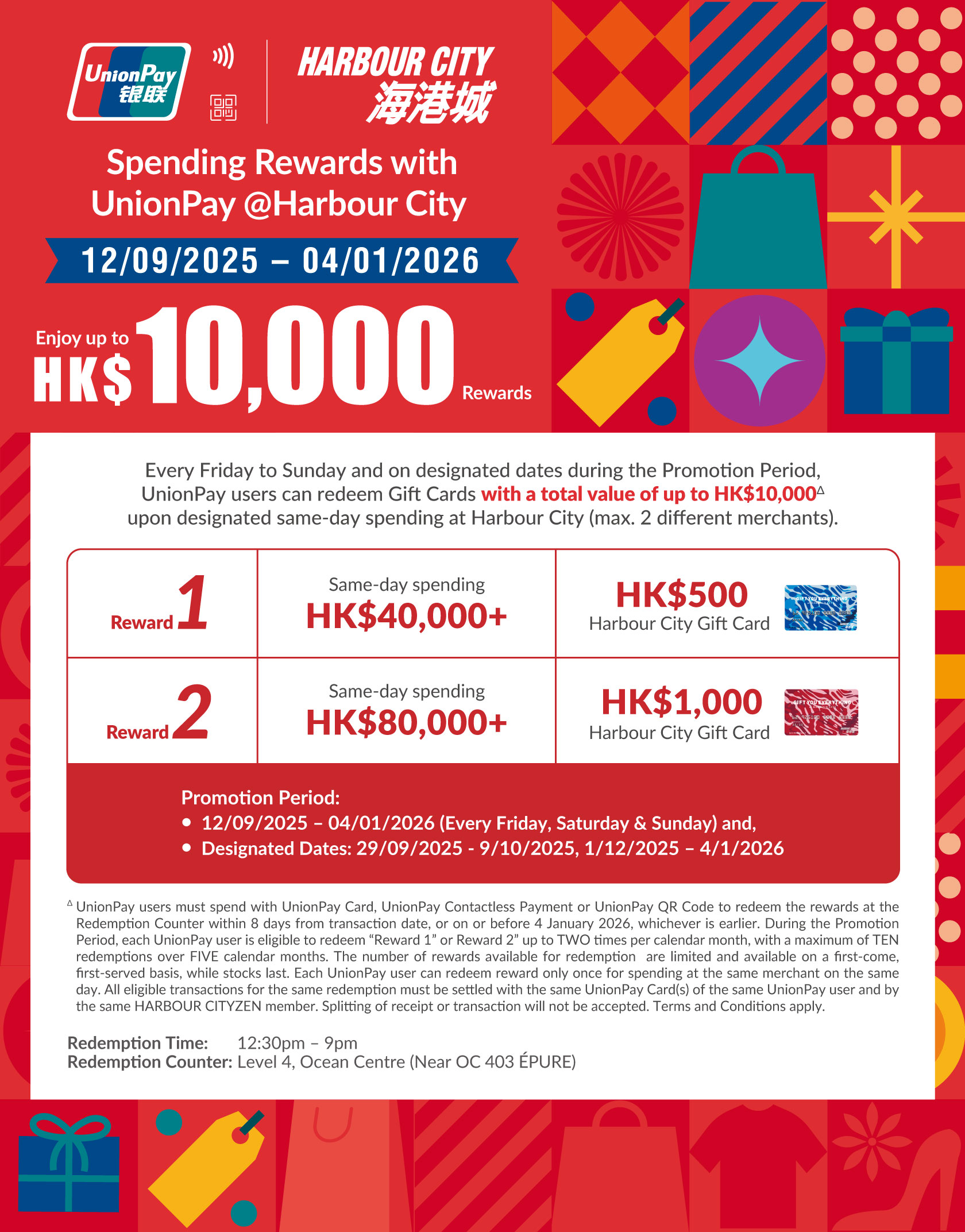 - Customers will receive a Collection Letter to redeem the respective “Harbour City Gift Card” upon redemption of the Reward. Customers are required to present their Eligible UnionPay Card used for the transaction and the original Collection Letter on or before 31 January 2026 in person at the Gift Card Sales Counter located at Level 4, Ocean Terminal, Harbour City (near Shroff Office). The Gift Card is valid for 12 months from the date of collection. Please refer to the terms and conditions on the Collection Letter and Gift Card for details. Lost, damaged, or altered Collection Letter will not be reissued, and the eligibility to redeem the gift card will be forfeited.