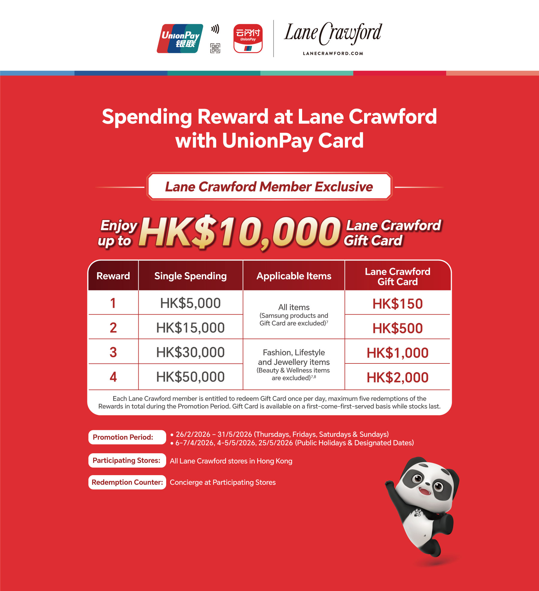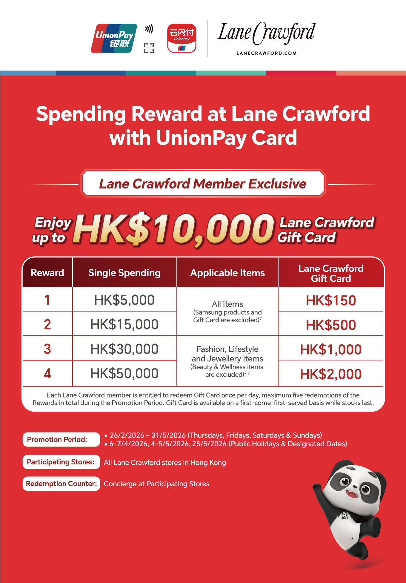 - The Promotion is applicable to all Lane Crawford stores in Hong Kong.