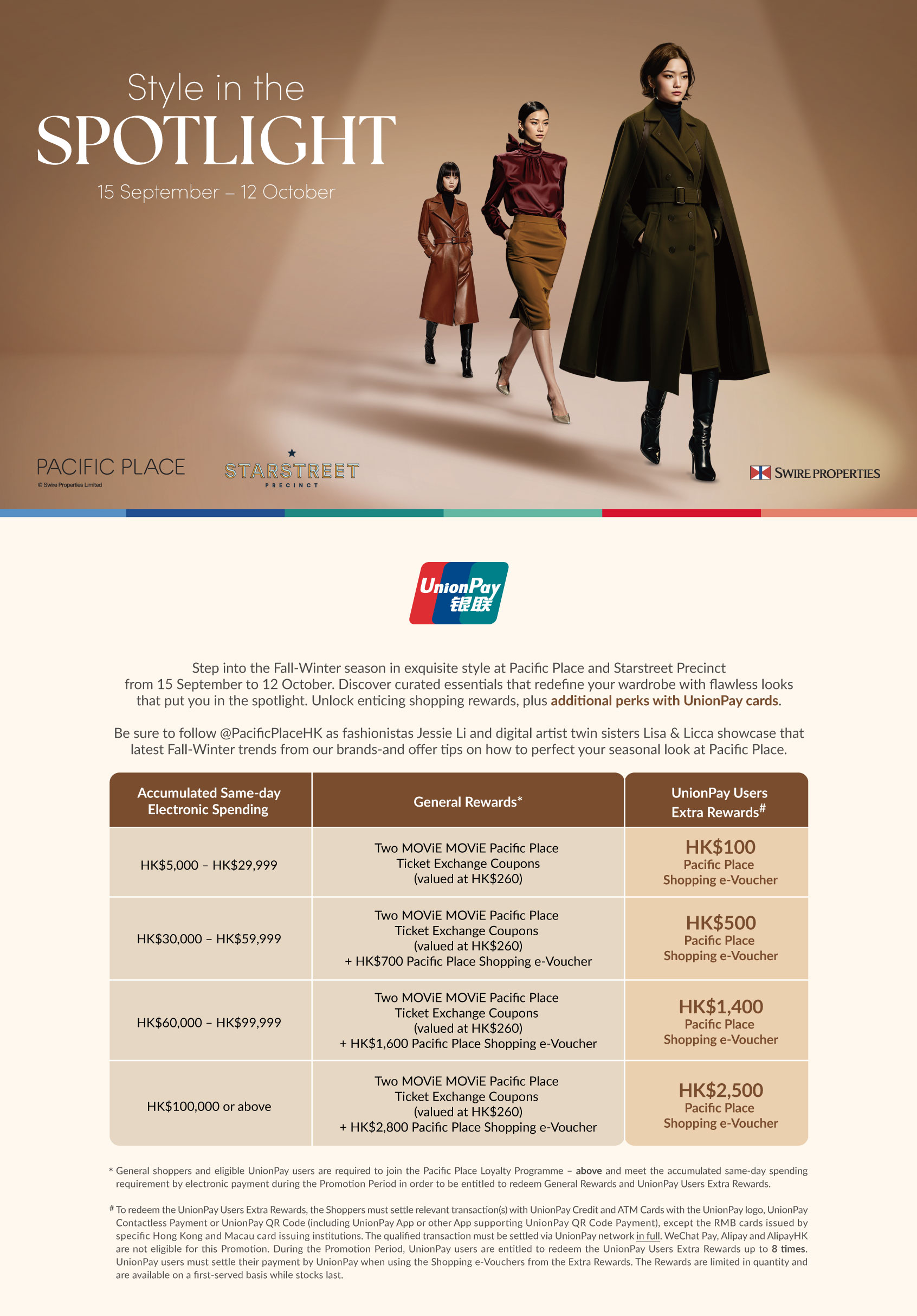 Electronic SpendingGeneral Rewards* UnionPay Users Extra Rewards HK$5,000 – HK$29,999 Two MOViE MOViE Pacific Place