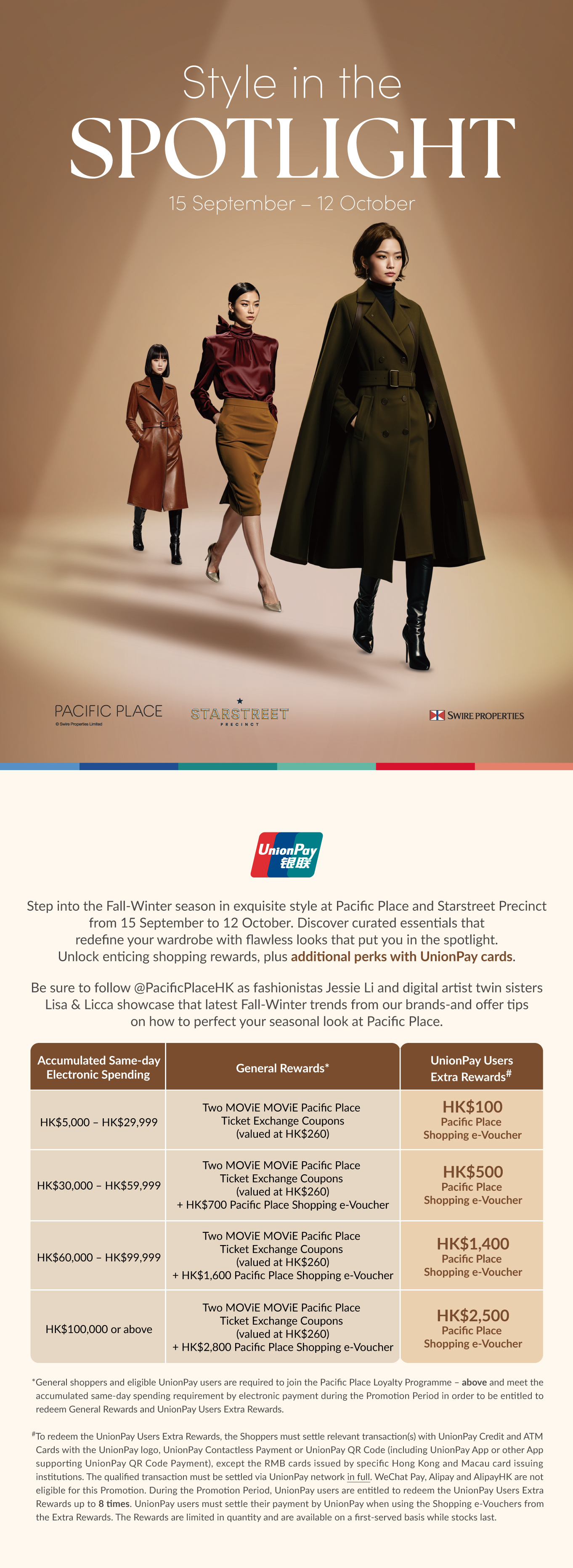 - Pacific Place Shopping e-Vouchers will be given out in the form of unconditional e-Vouchers at designated face value, and will be added to the Shoppers' wallets in Pacific Place mobile app instantly upon redemption of the Rewards. The e-Vouchers from General Rewards and UnionPay Users Extra Rewards are valid until 16 November 2025. Both sets of e-Vouchers will not be re-issued in case of expiry. UnionPay users must settle their payment by UnionPay when using the Shopping e-Vouchers from the Extra Rewards.