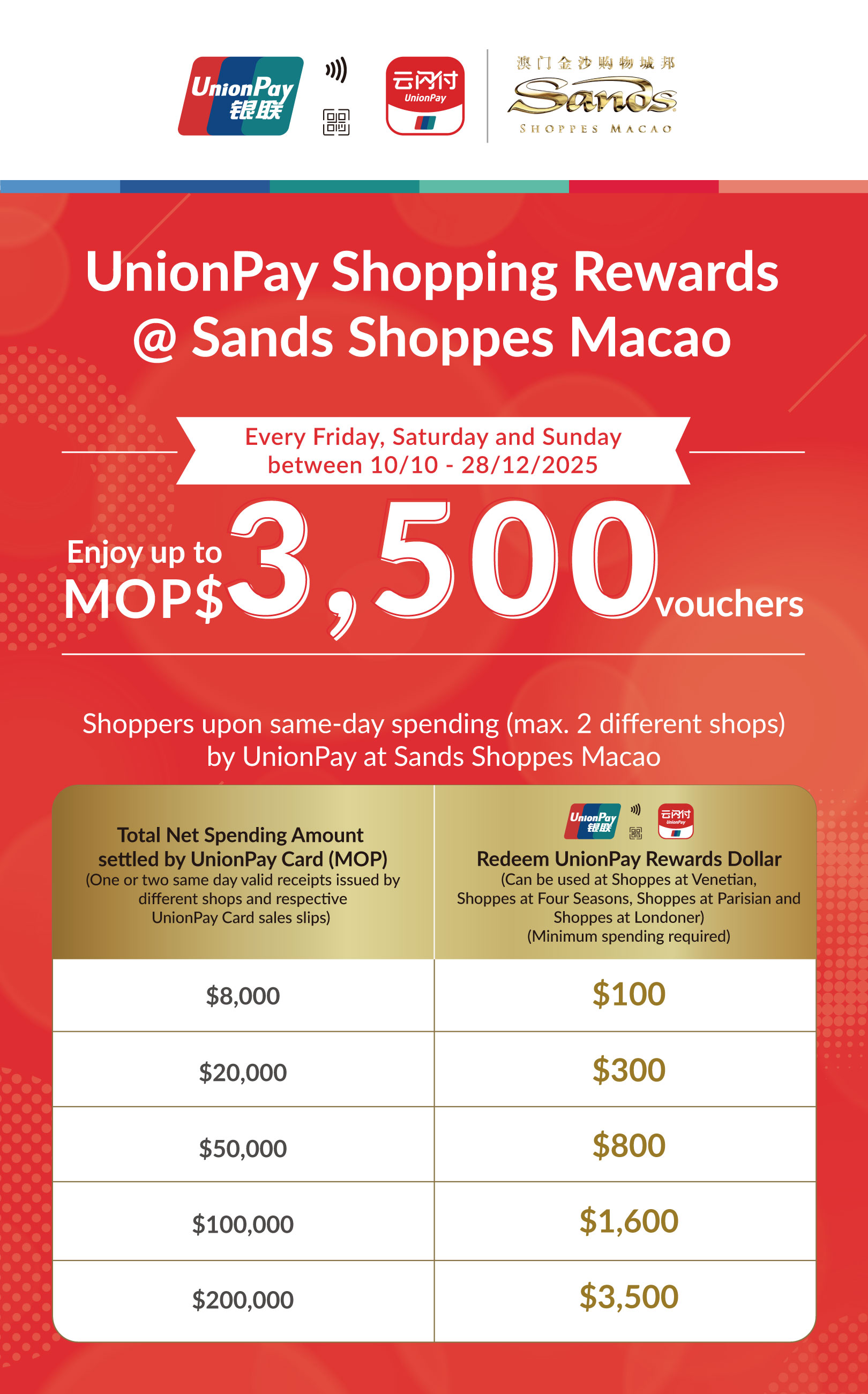 (MOP500 Rewards Dollar x 7pcs)b. Shoppers must present the valid Shops receipt / merchant sales invoice, respective UnionPay Card or transaction record(s) of UnionPay Mobile Payment, and UnionPay Card sales slip(s) of respective spending for redeeming the Rewards Dollar. The transaction date shown on the UnionPay Card sales slip(s) or transaction record(s) of UnionPay Mobile Payment must be within the Term of the Campaign. c. The transaction amount shown on the UnionPay Card sales slip(s) or transaction record(s) of UnionPay Mobile Payment must be the same or lower than that on the corresponding Shops receipts / merchant sales invoices. However, the total transaction amount on eligible UnionPay Card sales slip(s) or transaction record(s) of UnionPay Mobile Payment should meet the required Total Net Spending Amount under clause 5a in order to redeem the Rewards Dollar. UnionPay Card sales slip(s) or transaction record(s) of UnionPay Mobile Payment with a single transaction amount exceeding MOP499,999.99 will not be accepted to redeem the Rewards Dollar. d. All UnionPay Card or UnionPay Mobile Payment transactions via the UnionPay network under one receipt / merchant sales invoice shall be considered as a single UnionPay Card or UnionPay Mobile Payment transaction. The original copy of machine-printed Shops receipt / merchant sales invoice should clearly state the merchant name, transaction date, transaction amount and purchased products. The original copy of UnionPay Card sales slip or transaction record of UnionPay Mobile Payment should clearly indicate the UnionPay Card card number, merchant name, transaction date, transaction amount, valid authorization code and signature of Cardholders (if applicable). If Shopper cannot present the valid original copies of Shops receipt / merchant sales invoice, UnionPay Card sales slip(s) or transaction record(s) of UnionPay Mobile Payment, UnionPay Card with consistent information including UnionPay Card card number, merchant name, transaction date, transaction amount, etc., or the information provided by Shopper is insufficient, Shopper will not be able to redeem the Rewards Dollar for any reason. e. UnionPay Card sales slip(s) or transaction record(s) of UnionPay Mobile Payment and Shops receipts / merchant sales invoices that are damaged, outdated and unable to show clearly the transaction dates, time, amounts, currencies or without showing any card numbers are not acceptable. f. Each Shopper is limited to a maximum of 20 redemptions (regardless of the value) throughout the Term of the Campaign. g. The Rewards Dollar are available on a “first come, first served” basis, while stocks last. h. The Rewards Dollar cannot be redeemed for cash, changed or exchanged for other items. i. Lost, stolen or damaged Rewards Dollar cannot be reclaimed, refunded or replaced. j. The Campaign cannot be redeemed in conjunction with other campaigns and/or privileges (with exception to Sands Shoppes Macao's “Discover Sands Shoppes” Program). - Spending at Sands Shoppes Macao: