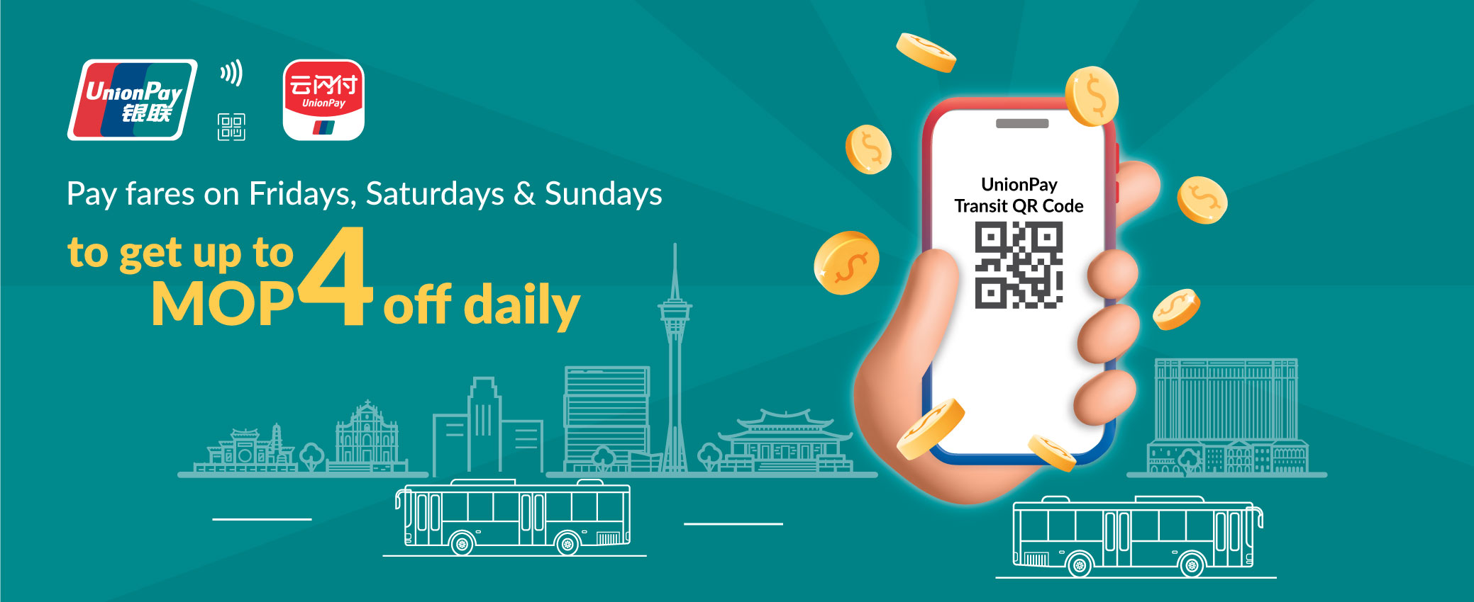 - Designated payment methods: The Promotion is applicable only to the UnionPay Transit QR Code using UnionPay Credit Cards, ATM Cards or Prepaid Cards (refers to “UnionPay Card”) bound to the mobile wallet app (including UnionPay APP, BOC Macau, BNU Pay, 廣發銀行海外, ICBC Mobile Banking APP, Luso Pay, TAI FUNG PAY, UePay) for paying public bus fares.