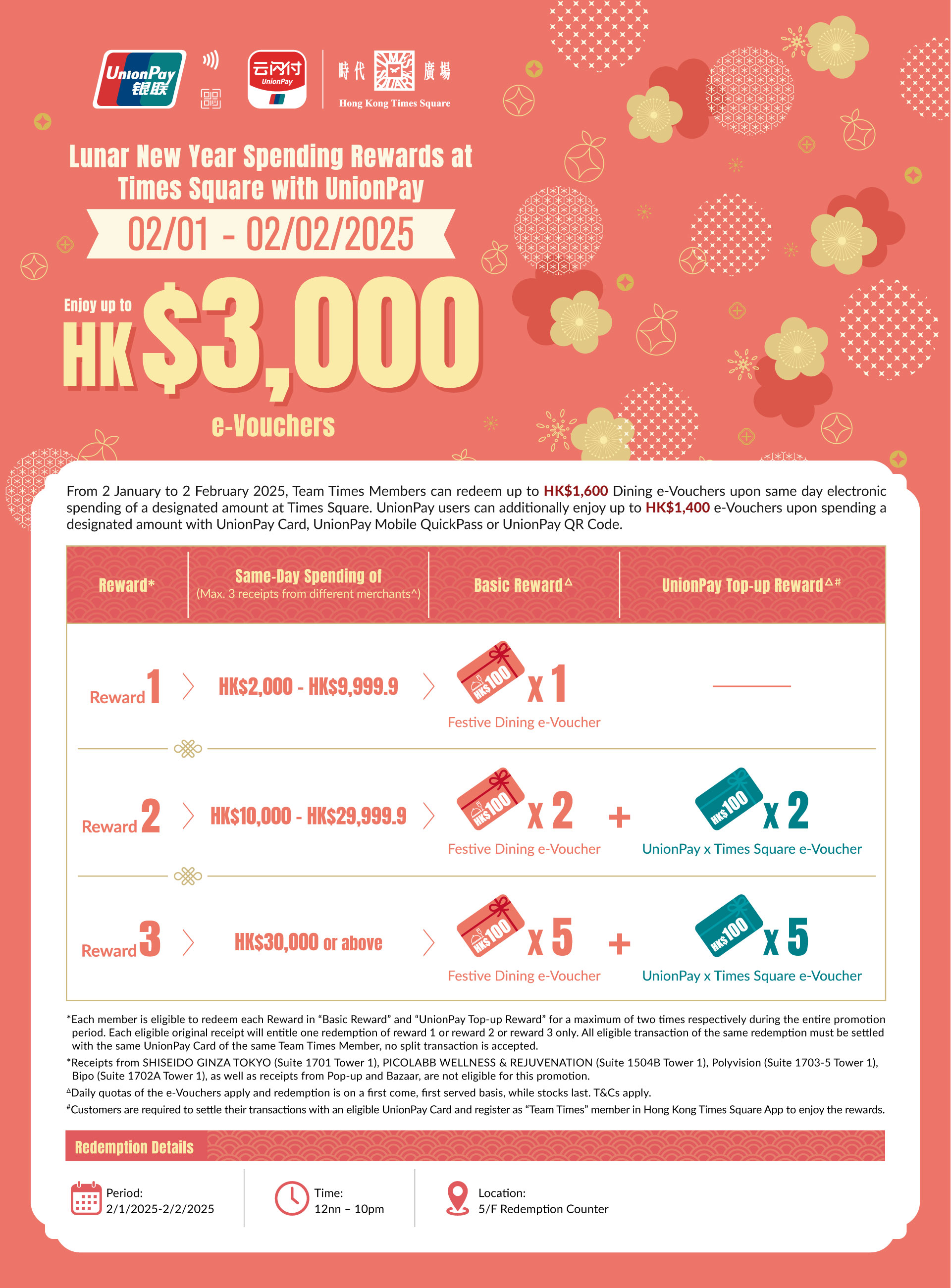 1) 1 piece of Times Square Festive HK$100 Dining e-Voucher upon spending of HK$2,000 – HK$9,999.9 (a maximum 3 sales slips from different outlets). 2) 2 pieces of Times Square Festive HK$100 Dining e-Voucher upon spending of HK$10,000 – HK$29,999.9 (a maximum 3 sales slips from different outlets). UnionPay user paying with eligible UnionPay Card is entitled to redeem an additional 2 pieces of HK$100 UnionPay x Times Square e-Voucher. 3) 5 pieces of Times Square Festive HK$100 Dining e-Voucher upon spending of HK$30,000 or above (a maximum 3 sales slips from different outlets). UnionPay user paying with eligible UnionPay Card is entitled to redeem an additional 5 pieces of HK$100 UnionPay x Times Square e-Voucher. - “Enjoy up to HK$1,600 Dining e-Vouchers” is calculated based on spending HK$2,000 – HK$9,999.9 at merchants in Times Square for 2 times redemption of 1 piece of Times Square Festive HK$100 Dining e-Voucher (total value HK$200), spending of HK$10,000 – HK$29,999.9 at merchants in Times Square for 2 times redemption of 2 pieces of Times Square Festive HK$100 Dining e-Voucher (total value HK$400), spending of HK$30,000 or above at merchants in Times Square for 2 times redemption of 5 pieces of Times Square Festive HK$100 Dining e-Voucher (total value HK$1,000) during the Promotion Period.