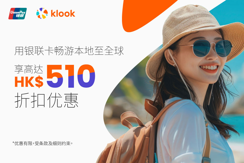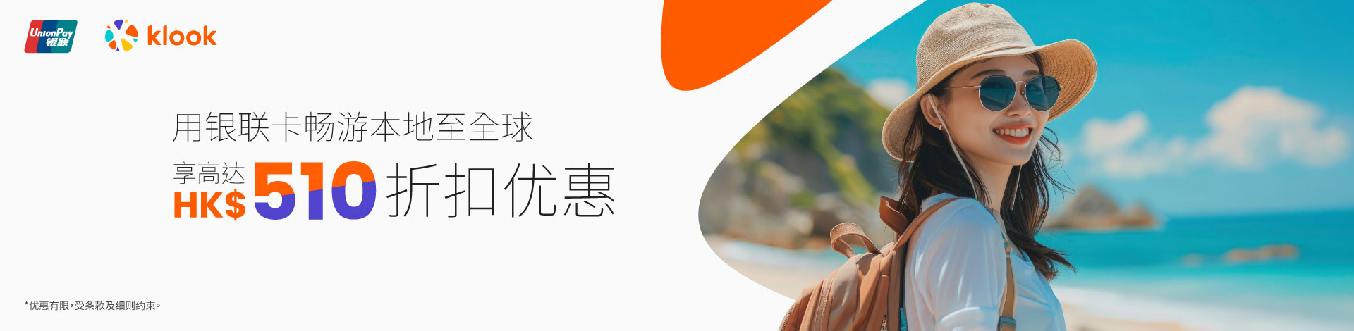- 推广期间,香港及澳门地区 Klook用户凭银联卡在Klook网站, 或App, 签账满额(不包括运费),并于付款时输入指定优惠码,即享高达HK$510折扣优惠 (下称「优惠 」)。