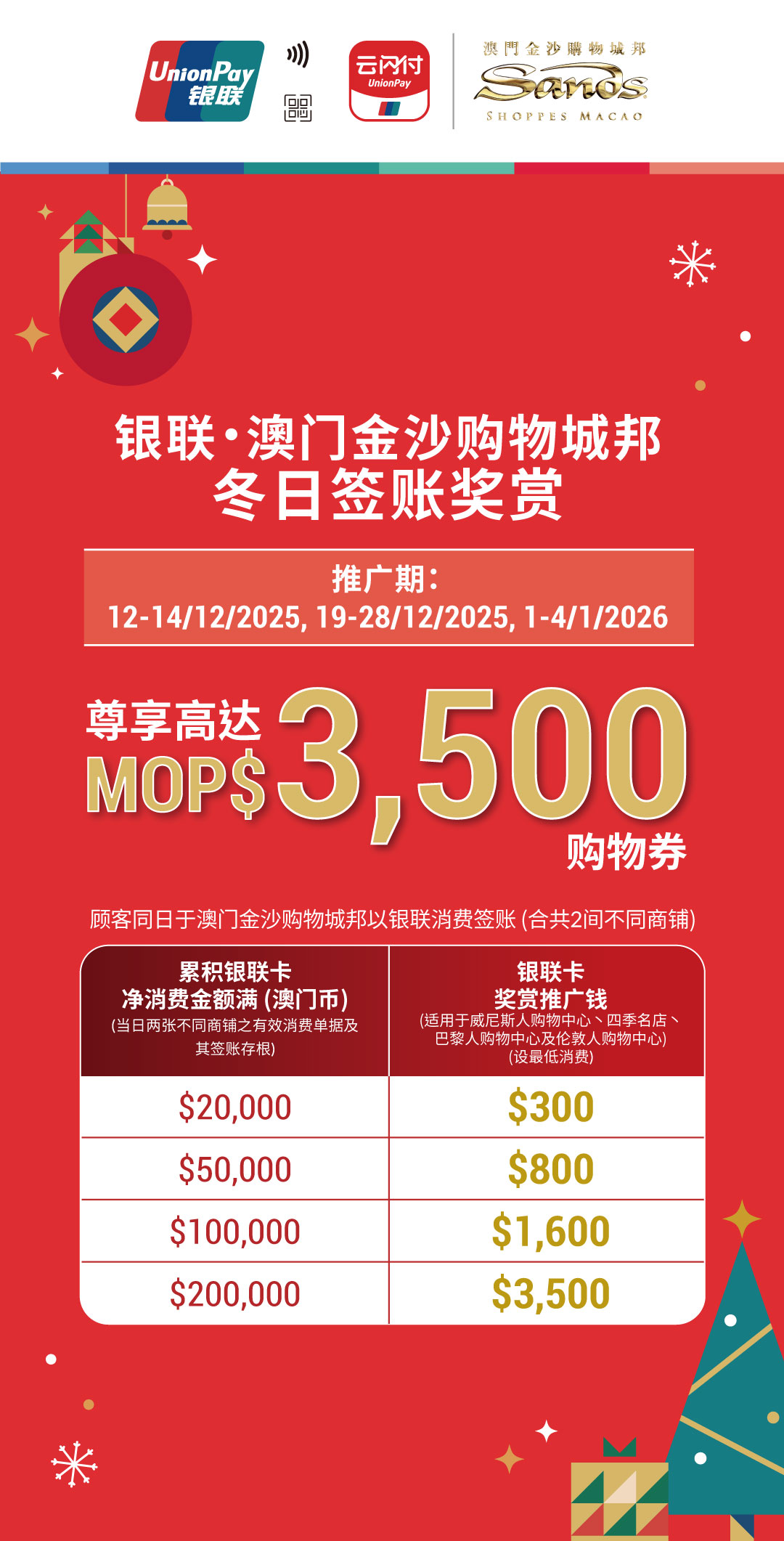 - 条款及细则:此活动「银联 • 澳门金沙购物城邦冬日签账奖赏」(以下简称“活动”)受以下条款及细则约束。