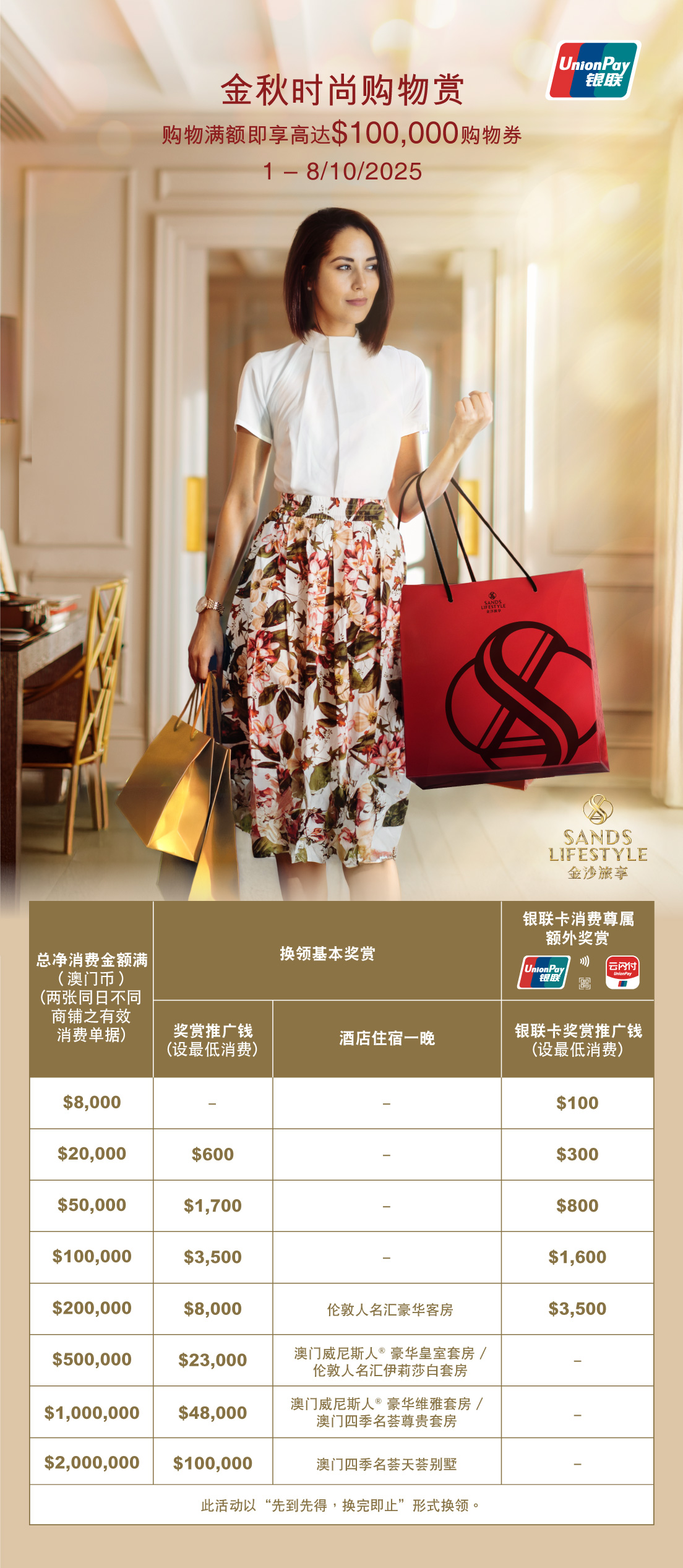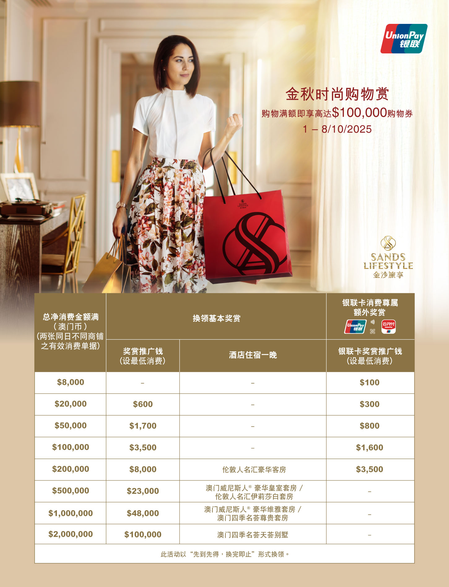 a. 顾客可使用由推广活动1基本奖赏换领所得的奖赏推广钱及由推广活动2银联卡消费尊属额外奖赏换领所得的额外奖赏推广钱至2025年10月15日(“有效日期”)。不论基于任何原因,奖赏推广钱之有效日期均不获延期。 b. 奖赏推广钱适用于任何金沙会参与商铺及专柜(四季名店及伦敦人购物中心的路易威登除外),除非奖赏推广钱上另有标示其他指定适用地点。 c. 顾客必须消费满以下金额以使用奖赏推广钱: • 每消费满澳门币300元方可使用价值澳门币100元之奖赏推广钱一张; • 每消费满澳门币1,500元方可使用价值澳门币500元之奖赏推广钱一张; • 每消费满澳门币3,000元方可使用价值澳门币1,000元之奖赏推广钱一张。 d. 如顾客于单次消费中使用多张印有最低消费金额要求之奖赏推广钱时,消费总金额必须等于或高于所有奖赏推广钱注明之最低消费金额的总和。 e. 如使用推广活动2之银联卡消费尊属额外奖赏之奖赏推广钱,顾客需以银联卡或银联移动支付通过银联网络缴付尾款。有关银联卡消费尊属额外奖赏之奖赏推广钱的附带使用条款及细则,详情请参阅该奖赏推广钱的背面。 f. 奖赏推广钱不可用作缴付酒店住宿费用。 g. 奖赏推广钱不得被转售、更换、退款或兑换成现金。如发现奖赏推广钱被转售,该等奖赏推广钱即视为无效且不得使用,该等转售奖赏推广钱的顾客及通过直接或间接方式购入奖赏推广钱的持票人应就所转售的奖赏推广钱对本公司产生或与之相关的任何直接或间接的损失、损害、成本、开支承担连带责任,包括但不限于向本公司赔偿相当于所转售奖赏推广钱的总面值金额。本公司有权在发出通知或不发出通知的情况下,取消该等顾客及/或购入经转售奖赏推广钱的持票人参与本活动或本公司或其关联公司未来的任何推广活动之资格。本公司保留其在发出通知或不发出通知的情况下取消购入经转售奖赏推广钱的持票人参加本公司客户奖赏计划或其他奖励资格的所有权利。 h. 任何奖赏推广钱经损坏、更改、复制、手写、伪造、水浸或以任何方式加以修改,或含任何电脑程序、印刷、机械、或排版错误,该奖赏推广钱即属无效且不得使用。 i. 此活动中发行之奖赏推广钱可与其他金沙会发行之奖赏推广钱同时使用并受各自之条款及细则约束。 - 使用尊尚住宿礼券: