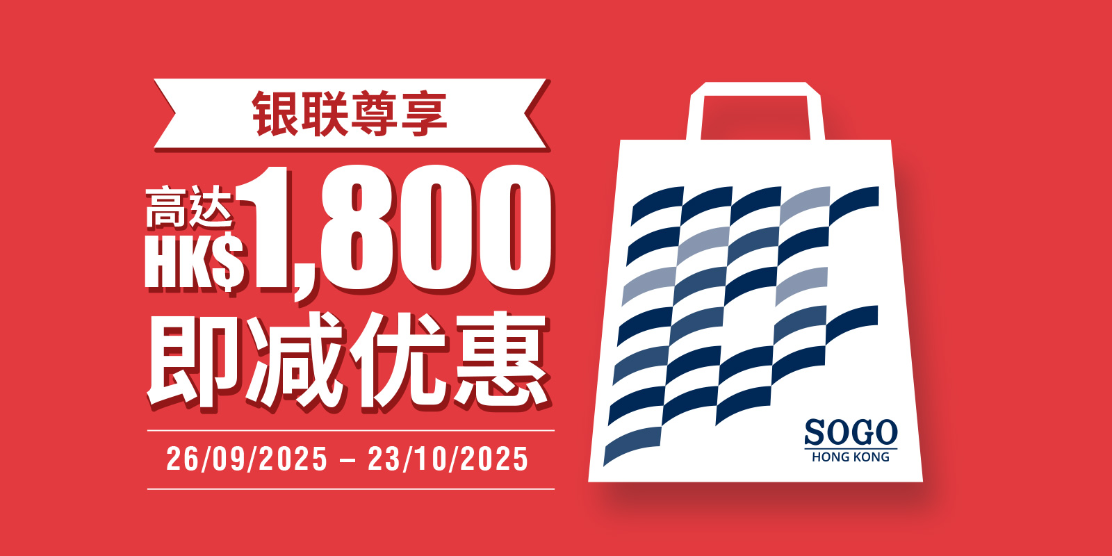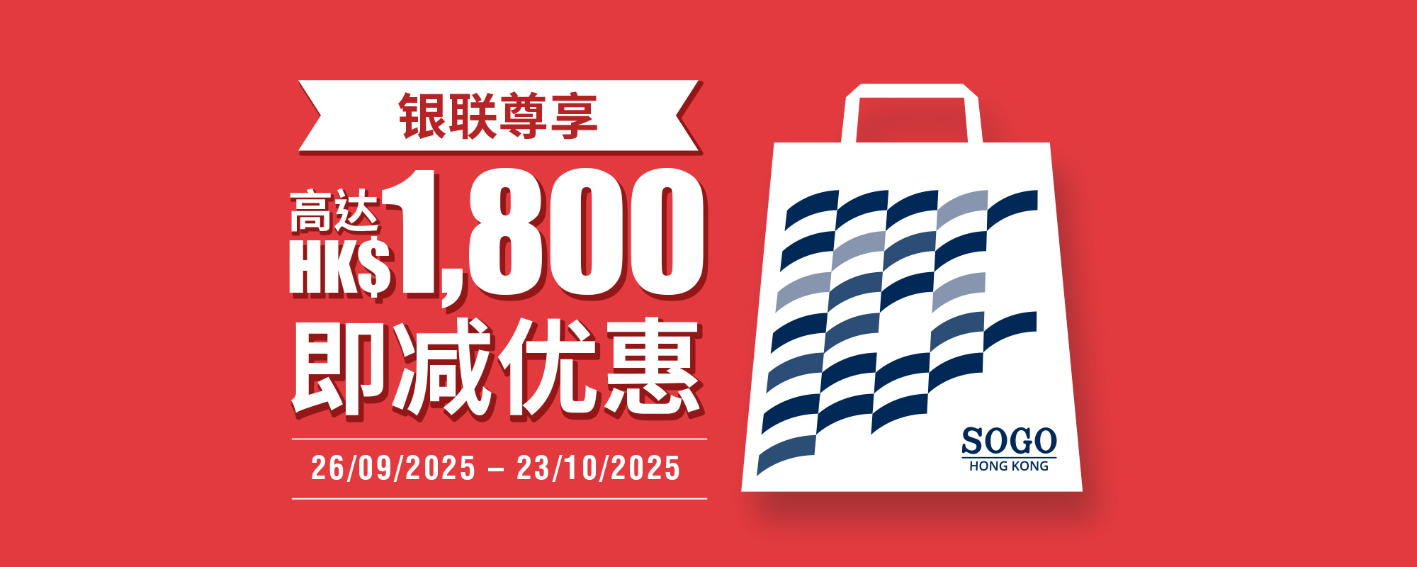 - 优惠适用于推广期在崇光铜锣湾店及崇光启德店(下称「参与门店」)指定收银处进行之交易。推广期内,持卡人于参与门店之实体店内,以银联手机Pay及银联二维码签账满指定金额,即享以下即减优惠∶