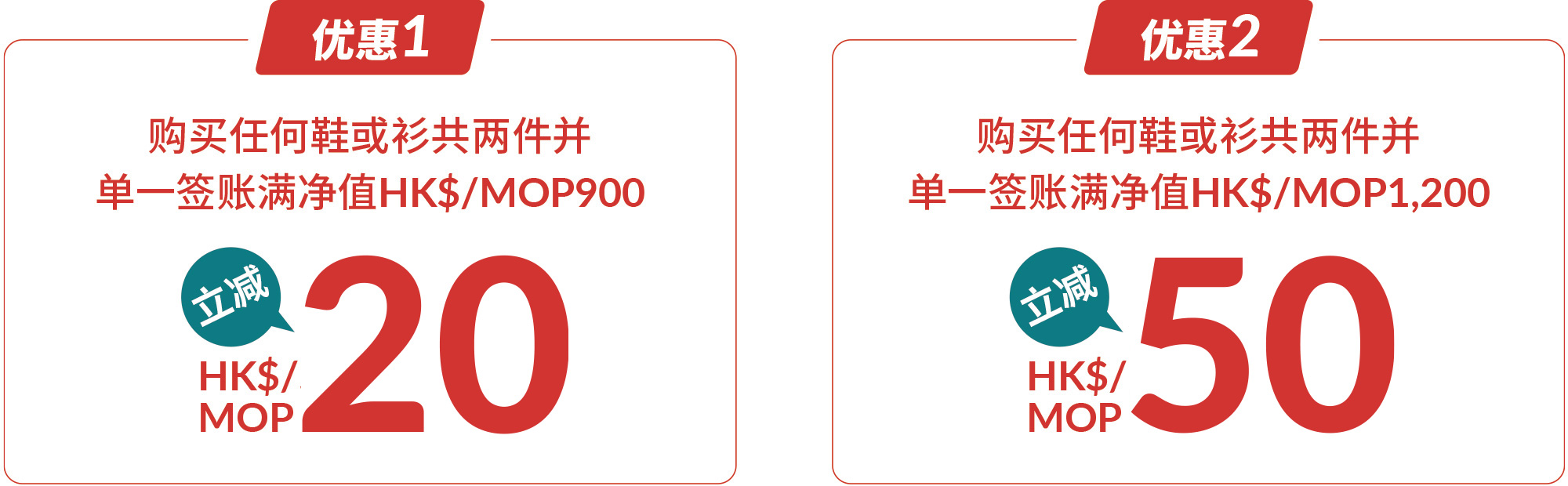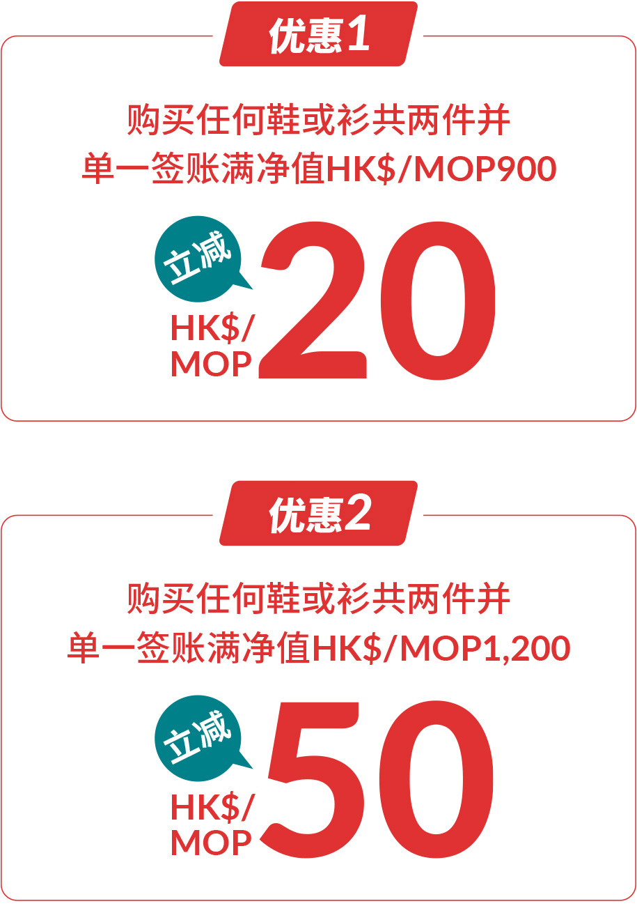 优惠1:购买任何鞋或衫共两件并单一签账满净值HK$/MOP900,立减HK$/MOP20(下称「立减优惠」);