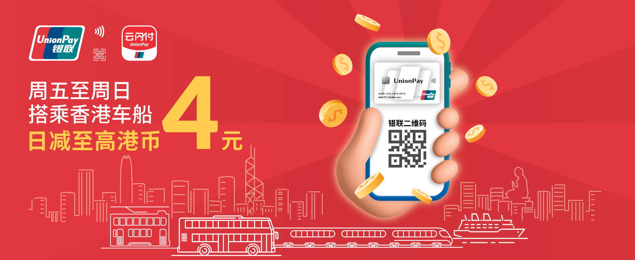 于2025年9月1日至11月30日期间的周五至周日,用银联手机Pay或支持香港乘车场景的银联二维码支付港铁、九巴、龙运、城巴、城巴机场快线、屿巴、专线小巴、香港电车、港九小轮、新渡轮、天星小轮车船费,单笔满港币3元或以上,享