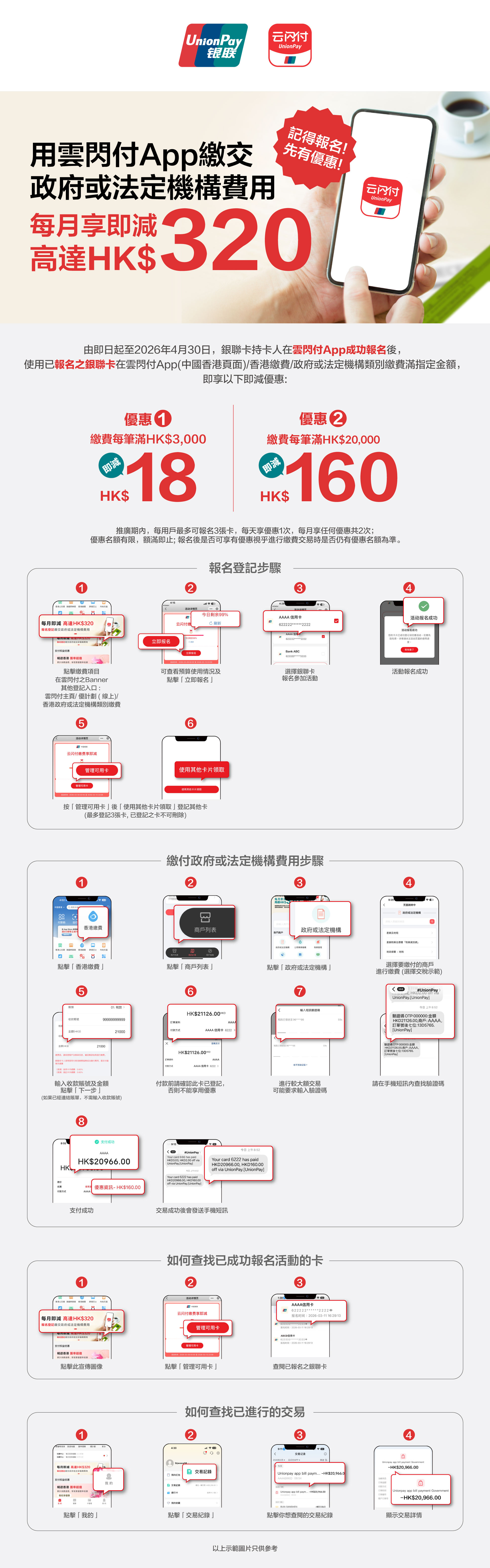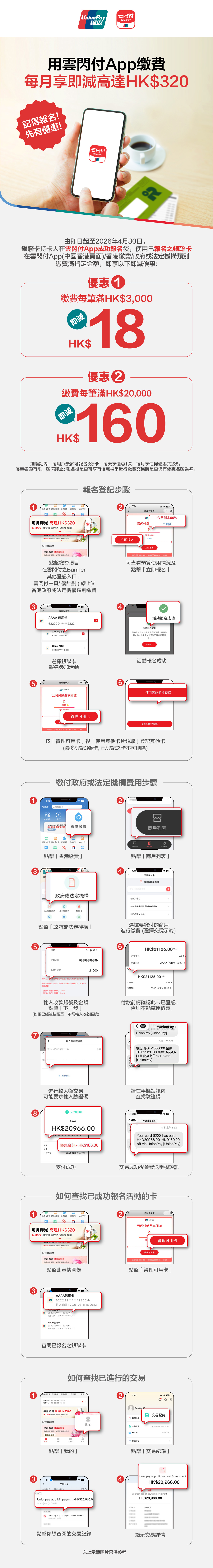 - 銀聯卡持卡人在雲閃付App成功報名後,使用合資格銀聯卡在雲閃付App(中國香港頁面)/香港繳費/商戶列表內政府或法定機構類別繳費滿指定金額,即享以下即減優惠: