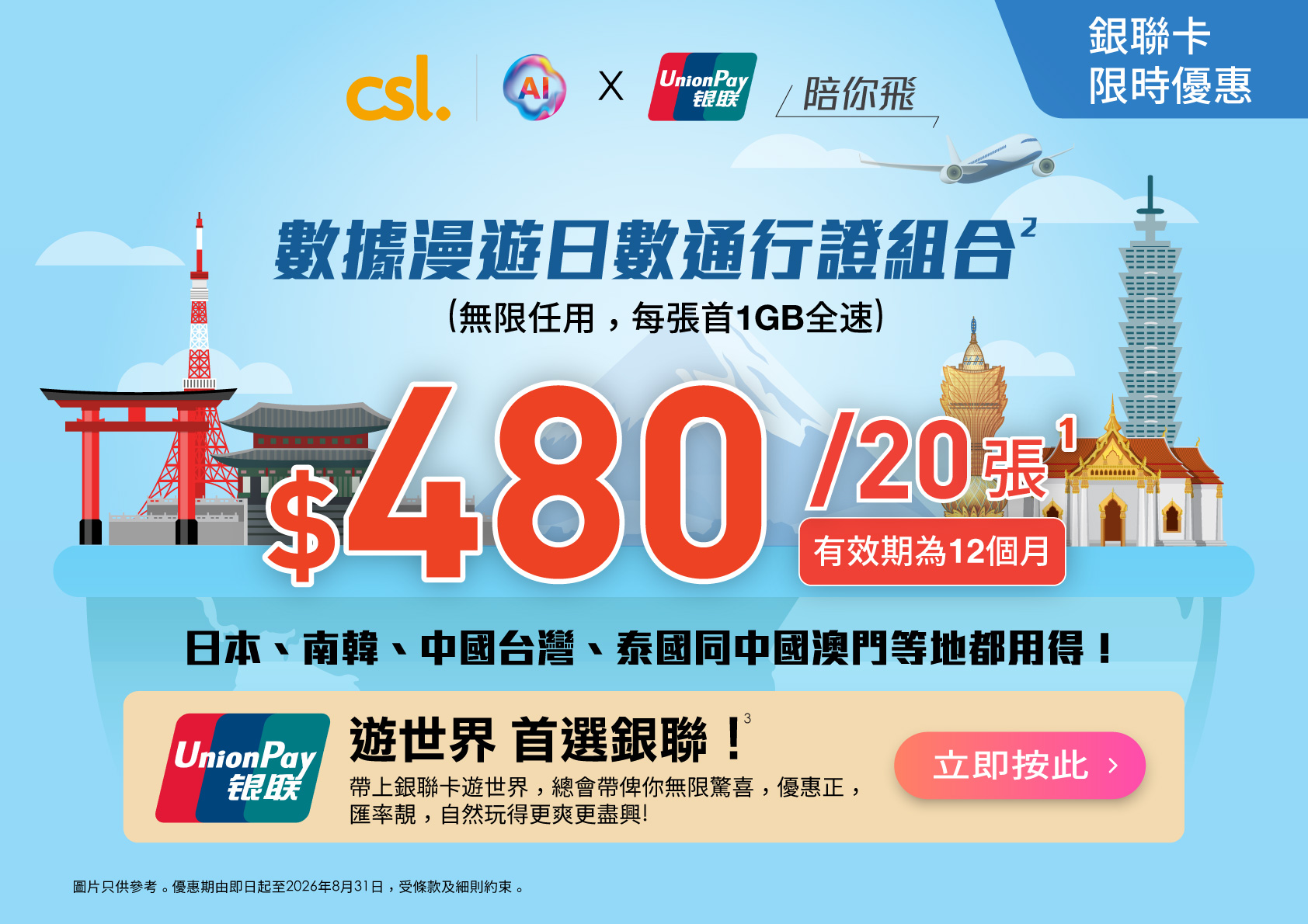 - 優惠只適用於持有由銀聯國際有限公司(「銀聯國際」)於香港所發行62字頭,卡面帶有銀聯標識的銀聯信用卡及提款卡(即 ATM 卡)、以銀聯手機Pay(包括但不限於 Apple Pay 及 Huawei Pay)或銀聯二維碼(包括雲閃付APP或其他支援銀聯二維碼的手機應用程式)(「合資格銀聯卡」)進行支付之持卡人(「持卡人」),惟香港指定發卡機構所發行之人民幣銀聯卡除外。持卡人必須使用銀聯卡通過銀聯網絡簽賬,方可享用優惠。其他付款方式如微信支付、WeChat Pay、支付寶、AlipayHK 恕不接受。客人必須於門市以合資格銀聯卡即時付款以享 $480「數據漫遊日數通行證組合 - 亞太精選 20 張」優惠。此優惠名額有限,並以先到先得的方式提供。優惠以香港身份證號碼計算,每個香港身份證號碼於優惠期內最多可以享用優惠5次。