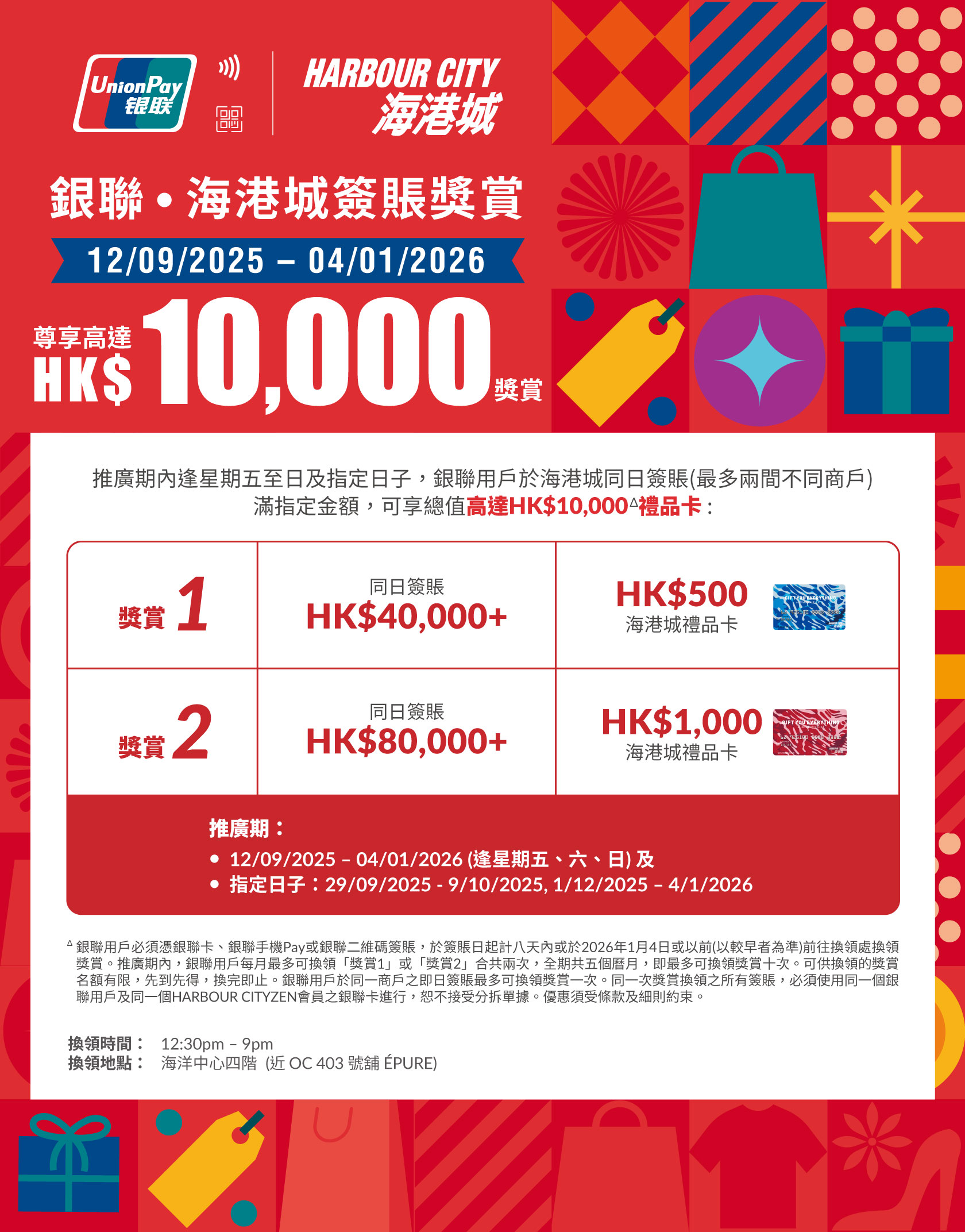 - 換領獎賞「海港城禮品卡」時,顧客將獲發換領信一封,並須於2026年1月31日或之前,憑換領有關獎賞之合資格銀聯卡及換領信正本親身前往海港城海運大廈四階近停車場繳費處之禮品卡銷售處換領「海港城禮品卡」乙張。禮品卡有效期為換領日起計12個月,詳情及條款請參閱換領信及禮品卡。換領信如遺失、遭受損壞或塗改,一律不獲重發,換領禮品卡之資格亦隨之失效。
