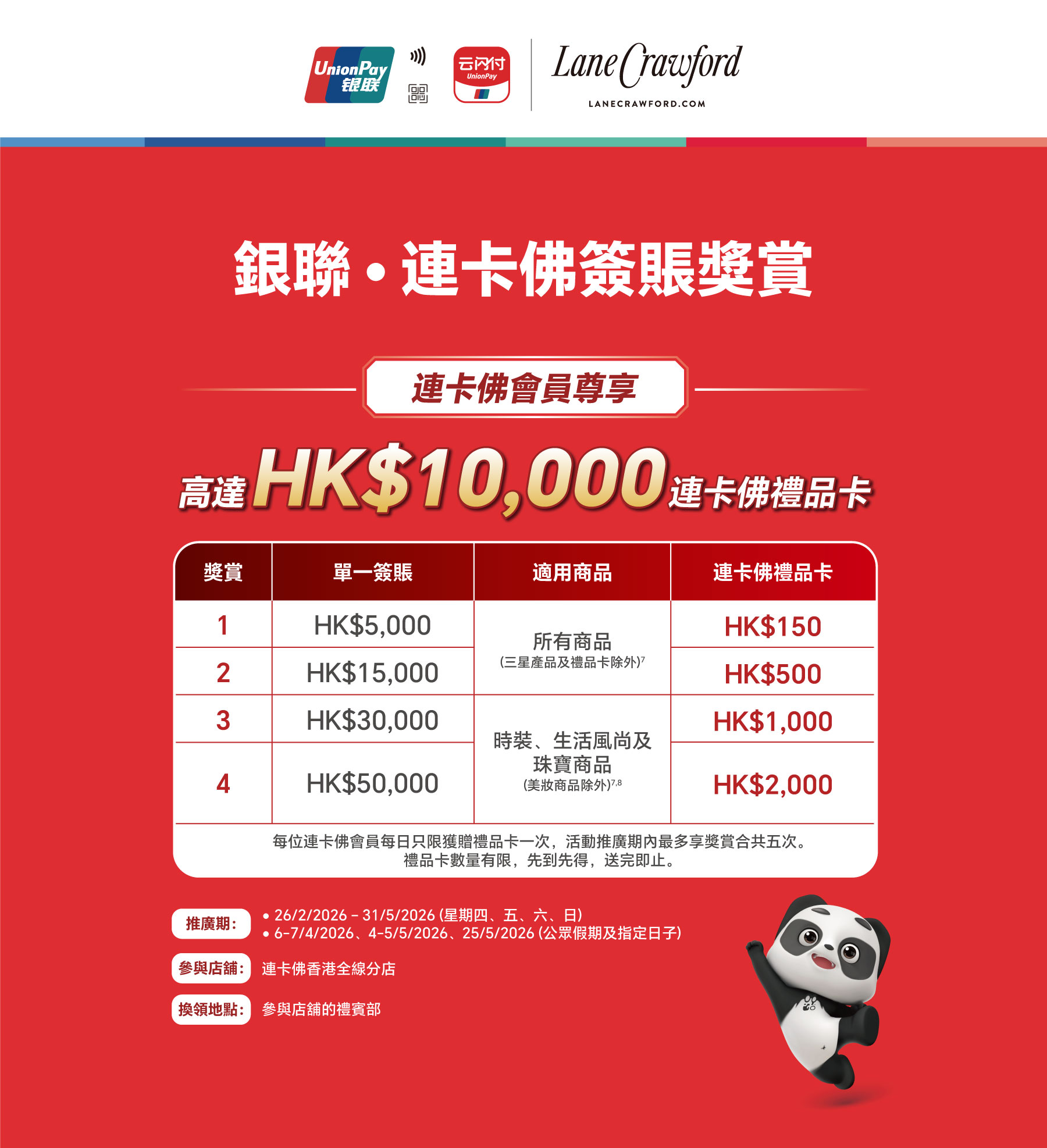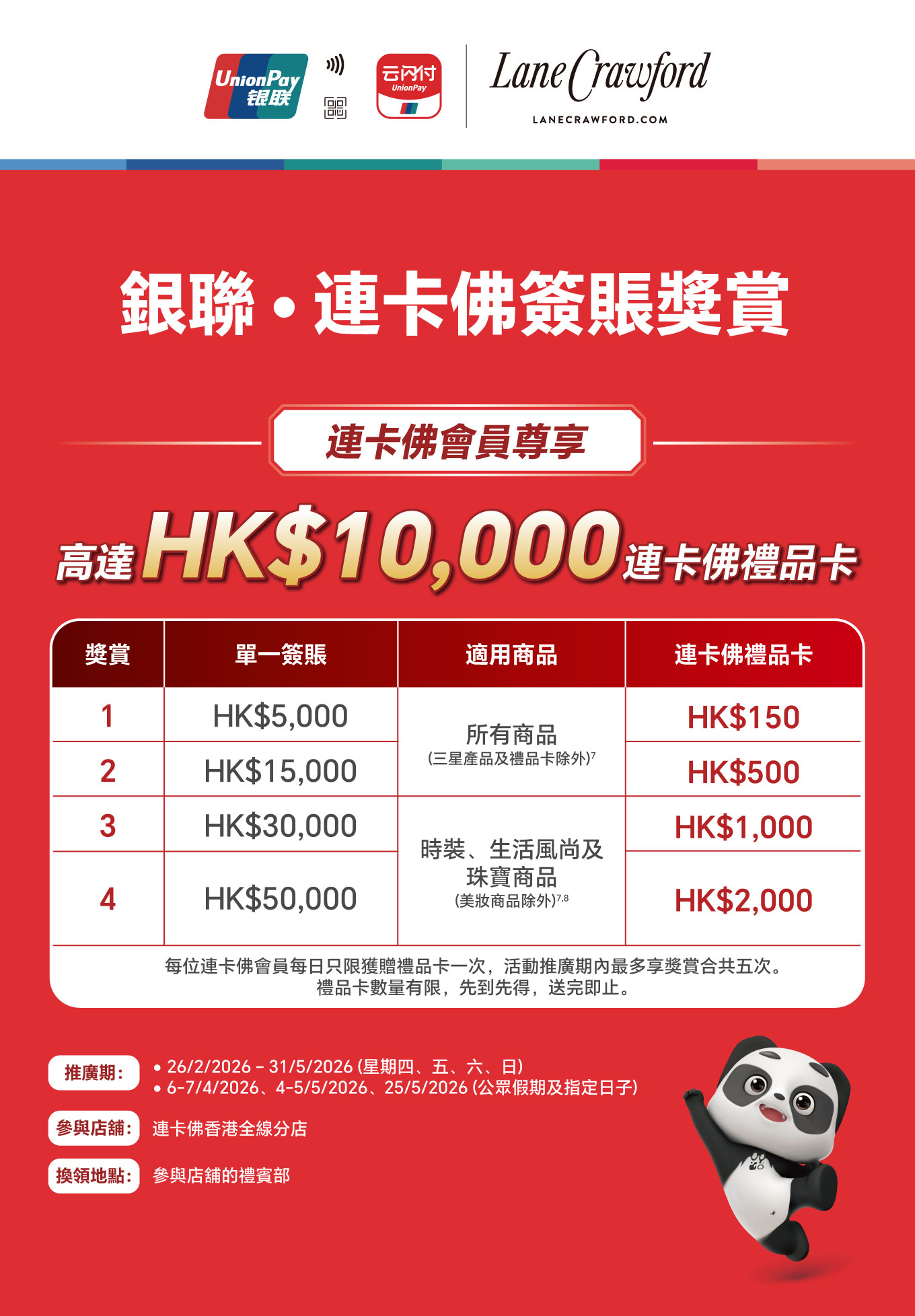 - 持卡人必須登記成爲連卡佛會員方可享有此優惠。