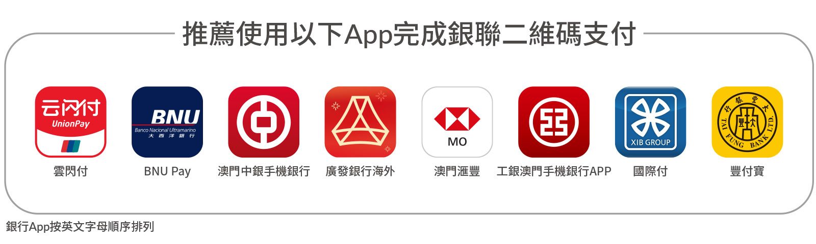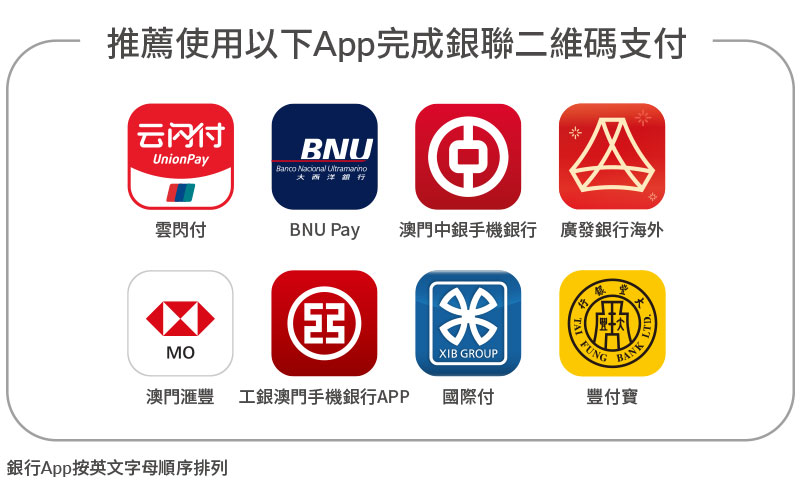 *銀聯二維碼適用於透過以下澳門銀行所發行之二維碼綁定銀聯卡進行之交易,包括BNU Pay、澳門中銀手機銀行、廣發銀行海外、澳門匯豐、工銀澳門手機銀行APP、國際付及豐付寶。