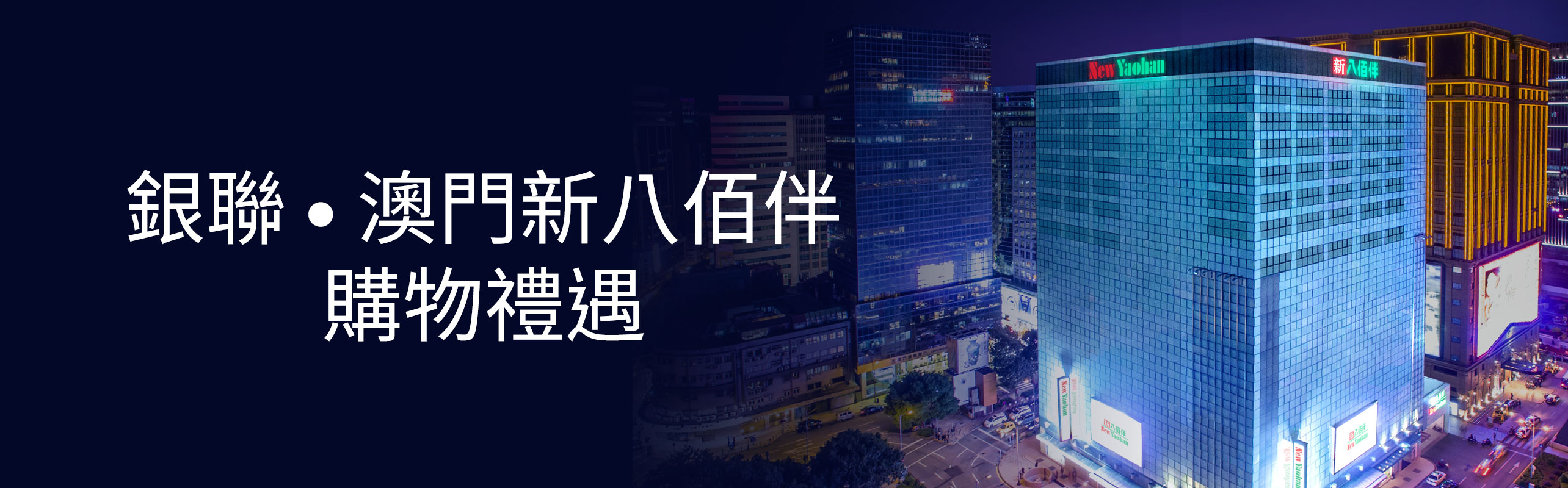 - 推廣期間,持卡人於指定連結成功報名後,即可憑已登記之銀聯卡在澳門地區新八佰伴(南灣店)、NY8新八佰伴(上葡京店)及兒童世界(星皓廣場店) 尊享以下優惠。持卡人在雲閃付成功報名後,憑銀聯手機Pay (包括Apple Pay, Huawei Pay等) 及銀聯二維碼消費滿額即享以下優惠,