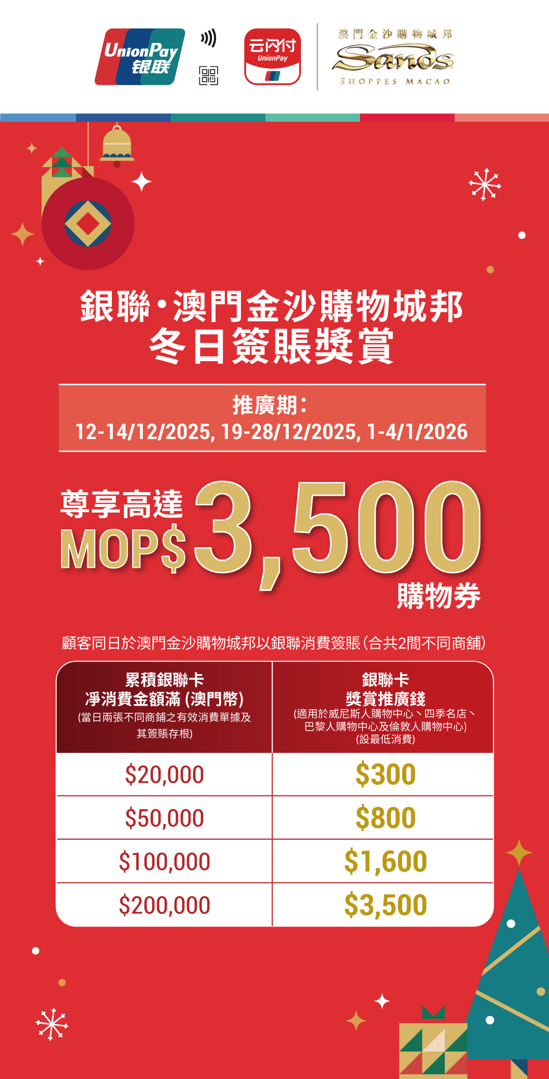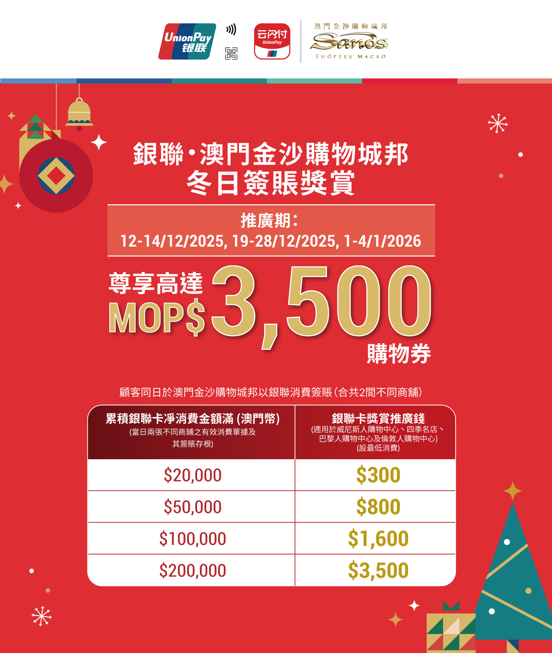 - 條款及細則:此活動「銀聯 • 澳門金沙購物城邦冬日簽賬獎賞」(以下簡稱“活動”)受以下條款及細則約束。