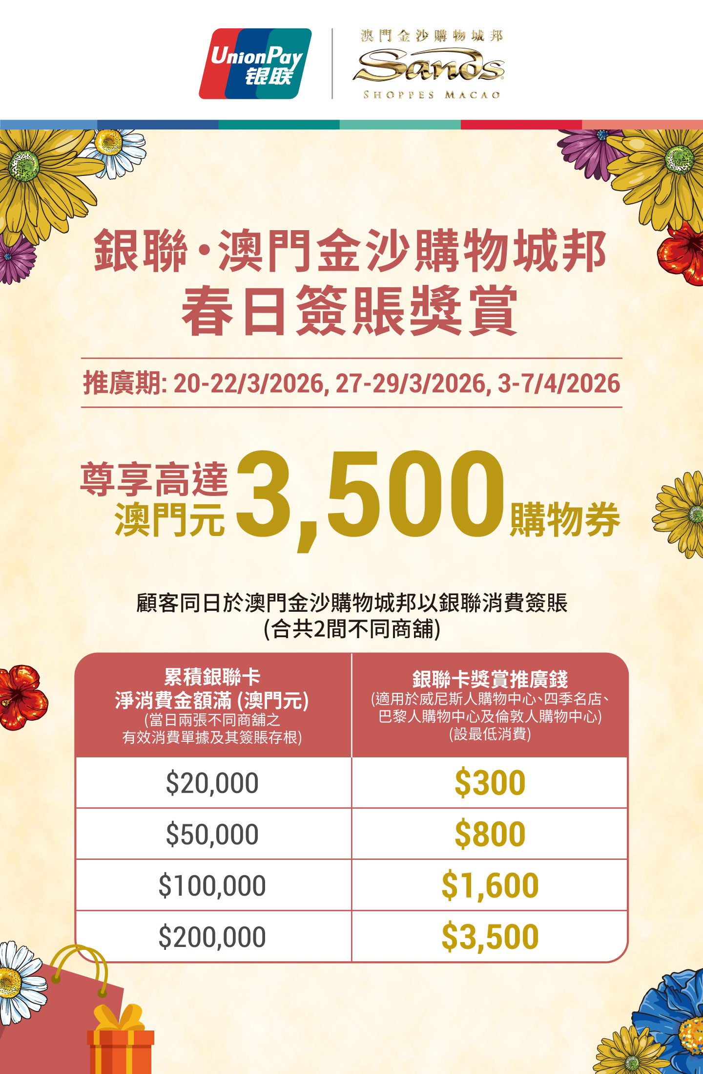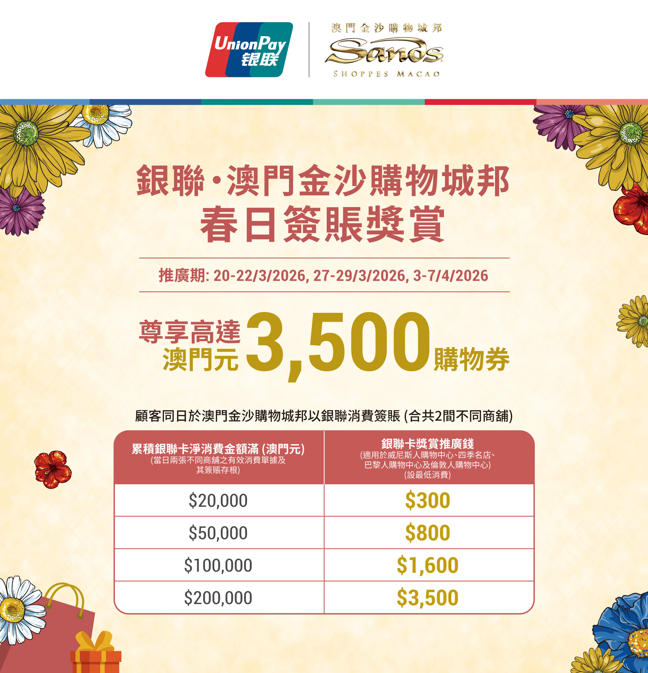 - 活動:此活動「銀聯 • 澳門金沙購物城邦春日簽賬獎賞」(以下簡稱“活動”)受以下條款及細則約束。