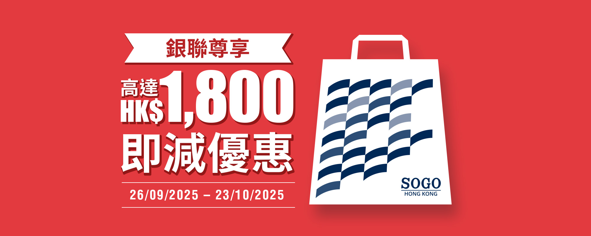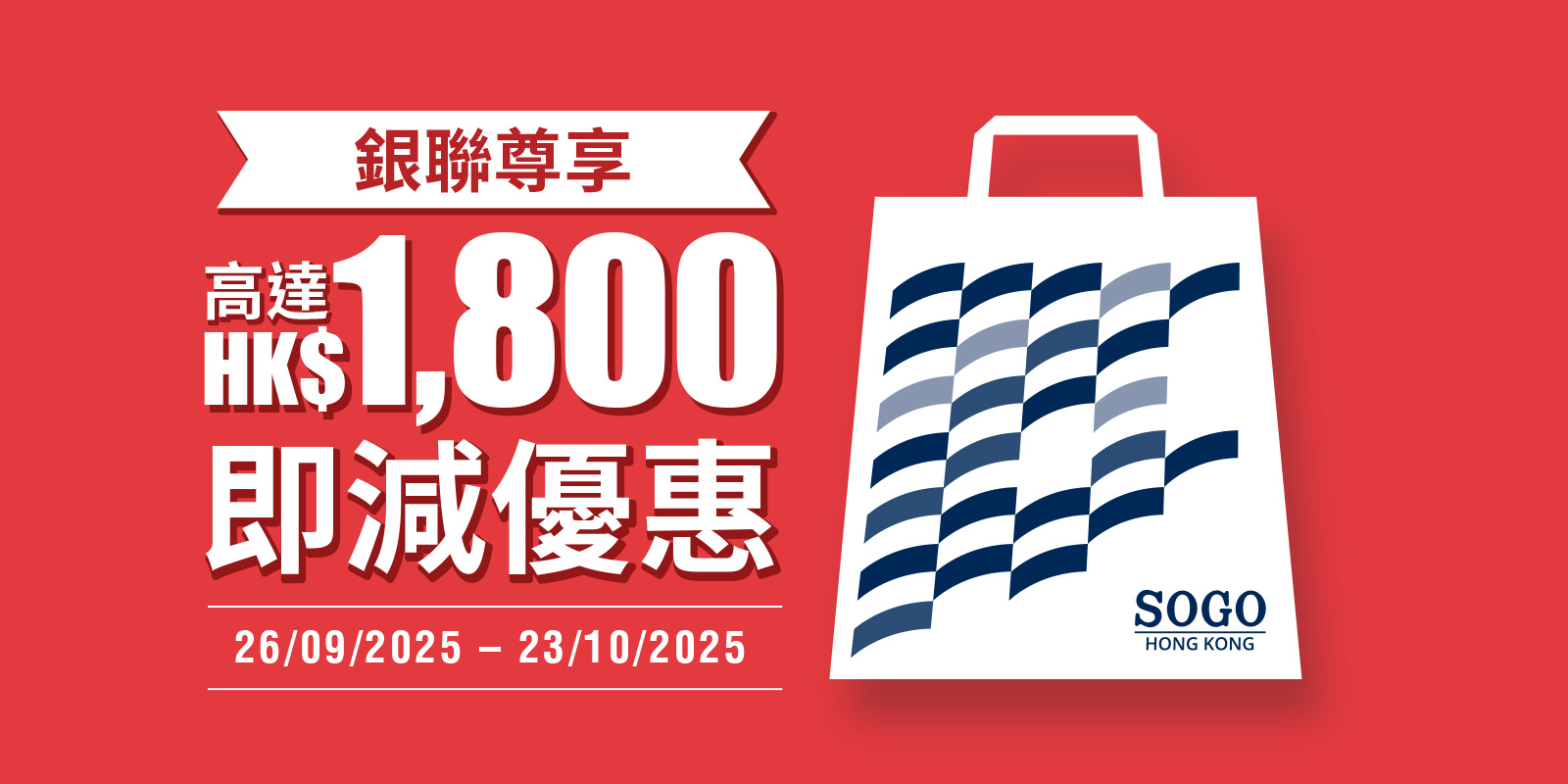 銀聯持卡人使用Apple Pay等銀聯手機Pay及銀聯二維碼於各樓層指定收銀處簽賬滿指定金額,尊享高達HK$1,800即減優惠!
