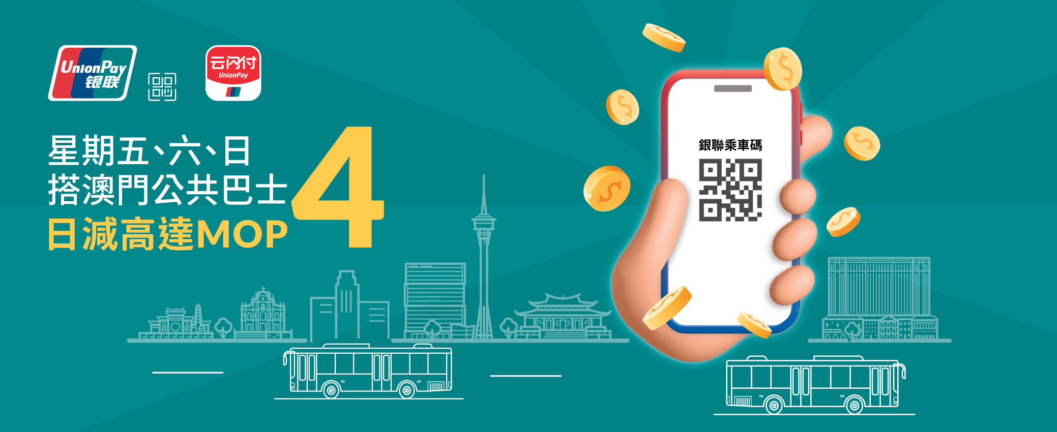 - 指定支付方式:活動只適用於以銀聯信用卡、提款卡或預付卡 (下稱「銀聯卡」)綁定應用程式以銀聯乘車碼 (包括雲閃付APP、澳門中銀手機銀行 、BNU Pay、廣發銀行海外、工銀澳門手機銀行APP、國際付、豐付寶、極易付)支付澳門公共巴士車費。